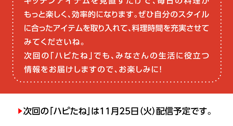 - ちょっと素敵な生活情報 ◎ハピたねvol.153 ◎毎日の料理がもっと楽しくなる!「おすすめのキッチンアイテムをご紹介」