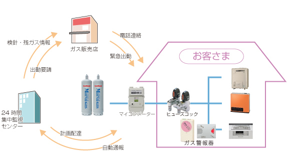 LPガス使用量を表示するメーターにマイコンを内蔵。ガスの使用状態を監視する機能を併せ持ちます。長時間使用、過大流量、地震時のガス使用など、使用状態の異常を判断すると自動的にガスをしゃ断、その内容を液晶画面に表示します。